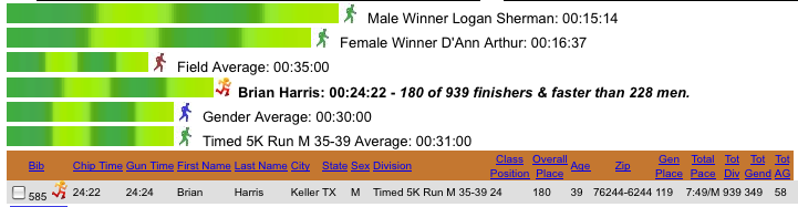 Just noticed something pretty cool. I actually set two PRs during my 10k race a couple of weeks ago. My 10k time of 57:47 was a new PR. So I was going back and checking my splits from that race, and I noticed that my time at the half-way point (at 5k) was 28:12, which beats my 5k PR of 28:54 set back in May.